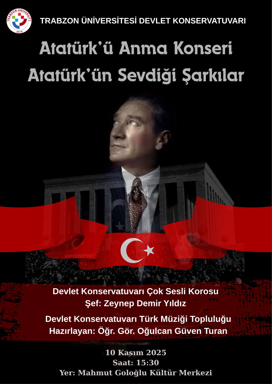 Cumhuriyetimizin kurucusu Gazi Mustafa Kemal Atatürk’ün 87. ölüm yıl dönümünde, onu sevdiği şarkılarla anmak amacıyla düzenlenen bu anlamlı etkinlikte, Trabzon Devlet Konservatuvarı Çok Sesli Korosu ve Klasik Türk Müziği Topluluğu sahne alacak. Bu özel günde, Atatürk'ün müzikle olan derin bağını ve Türk kültürüne olan katkılarını bir kez daha hatırlarken, ona olan saygımızı ve minnettarlığımızı dile getireceğiz.